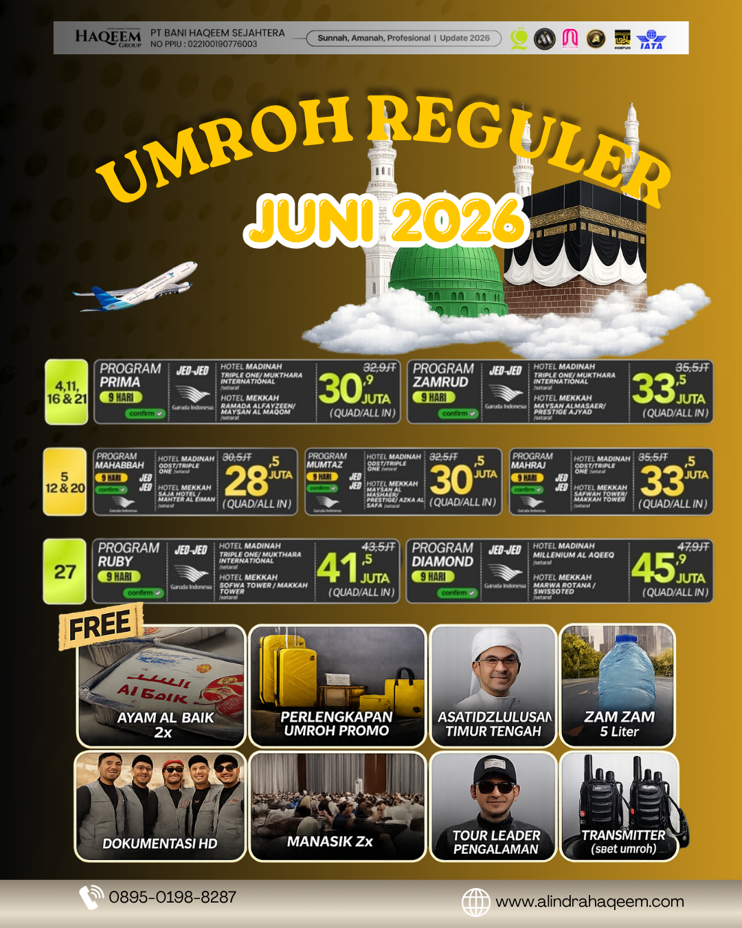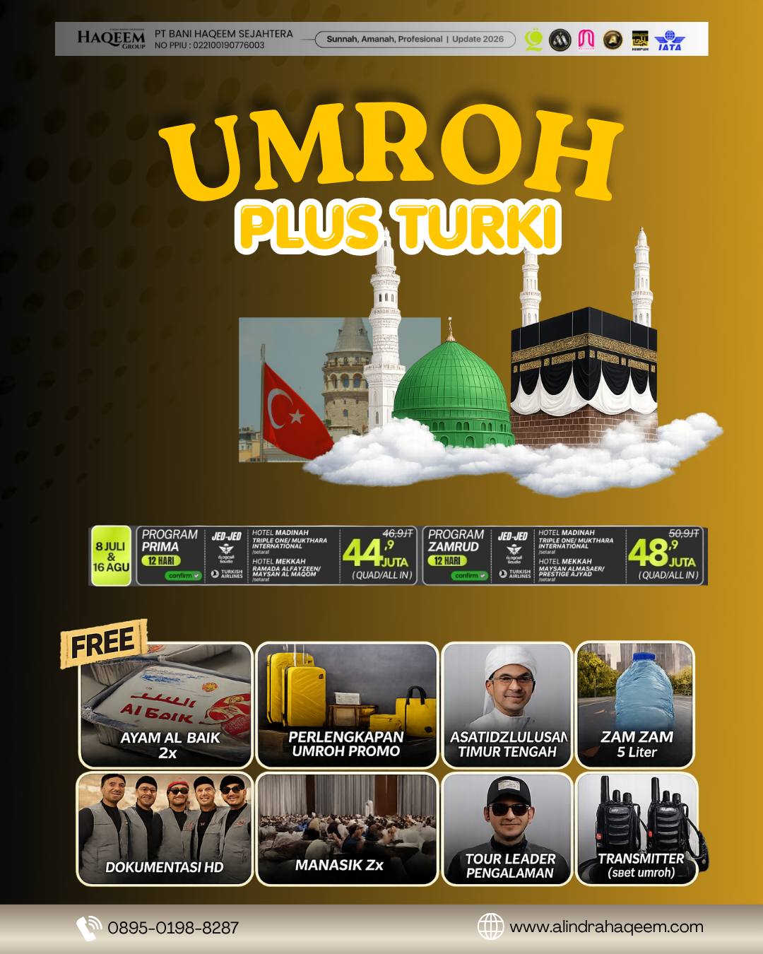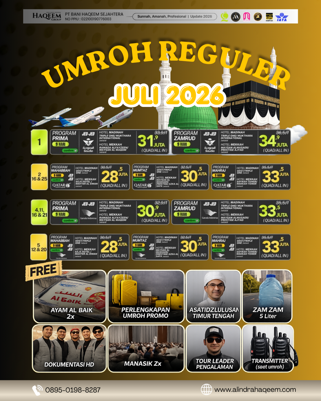 Haqeem Travel adalah Travel Umroh dengan Izin PPIU No. 02210019007760003 Penyelenggara ibadah Umrah yang bisa dipercaya, amanah, jujur, senantiasa berusaha mendampingi tamu-tamu Allah menuju Baitullah dan memberikan pelayanan terbaik guna mencapai ibadah umrah yang makburah