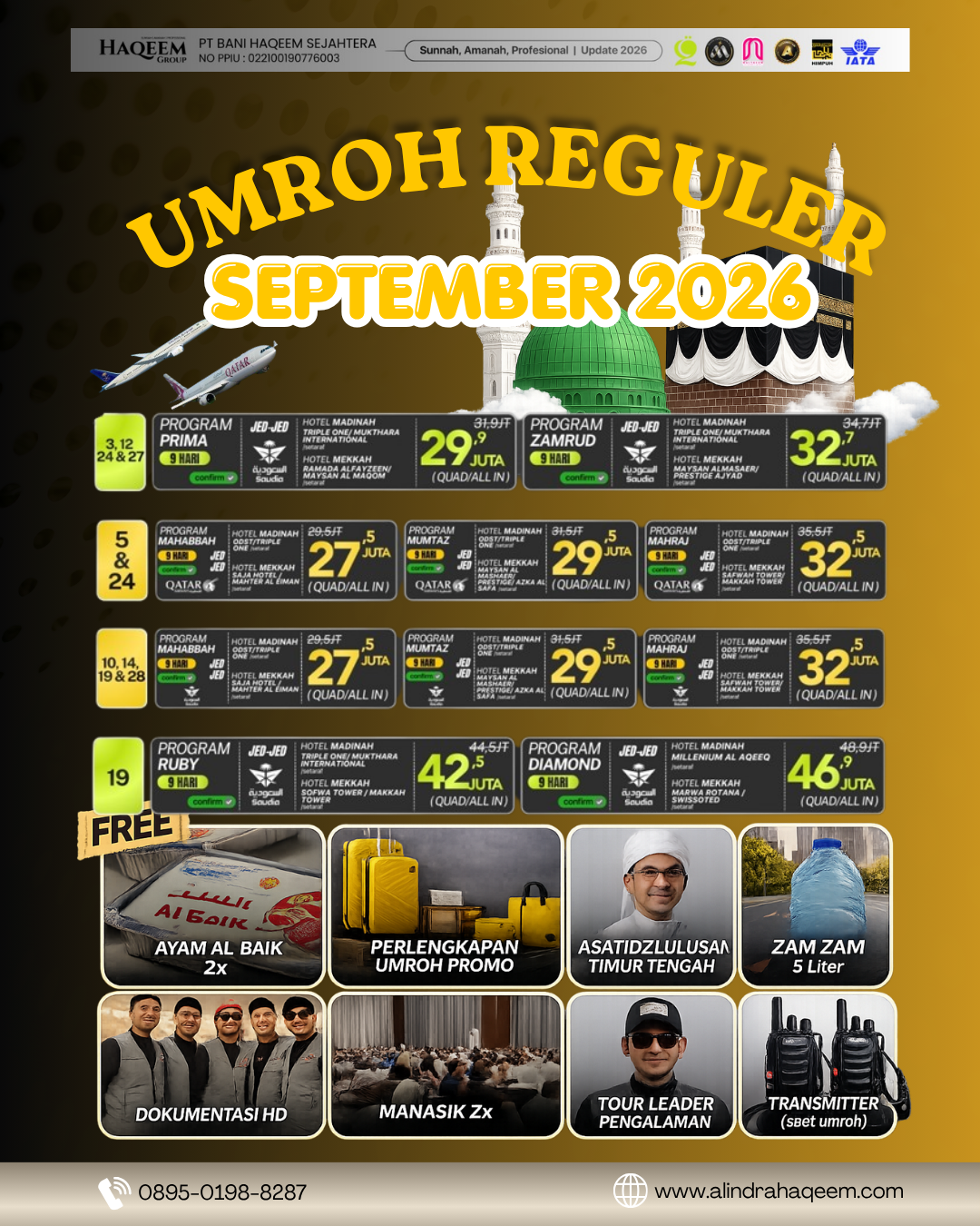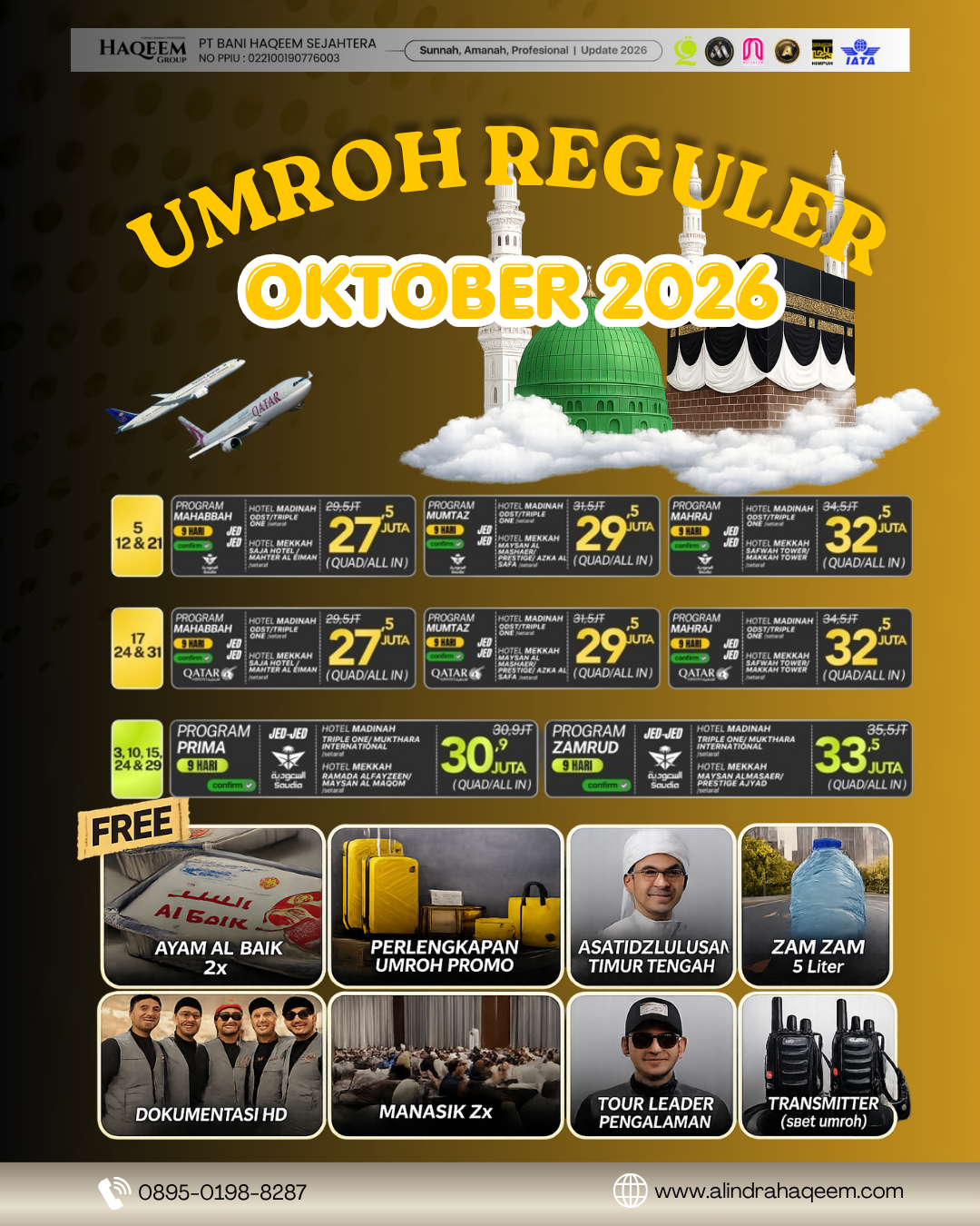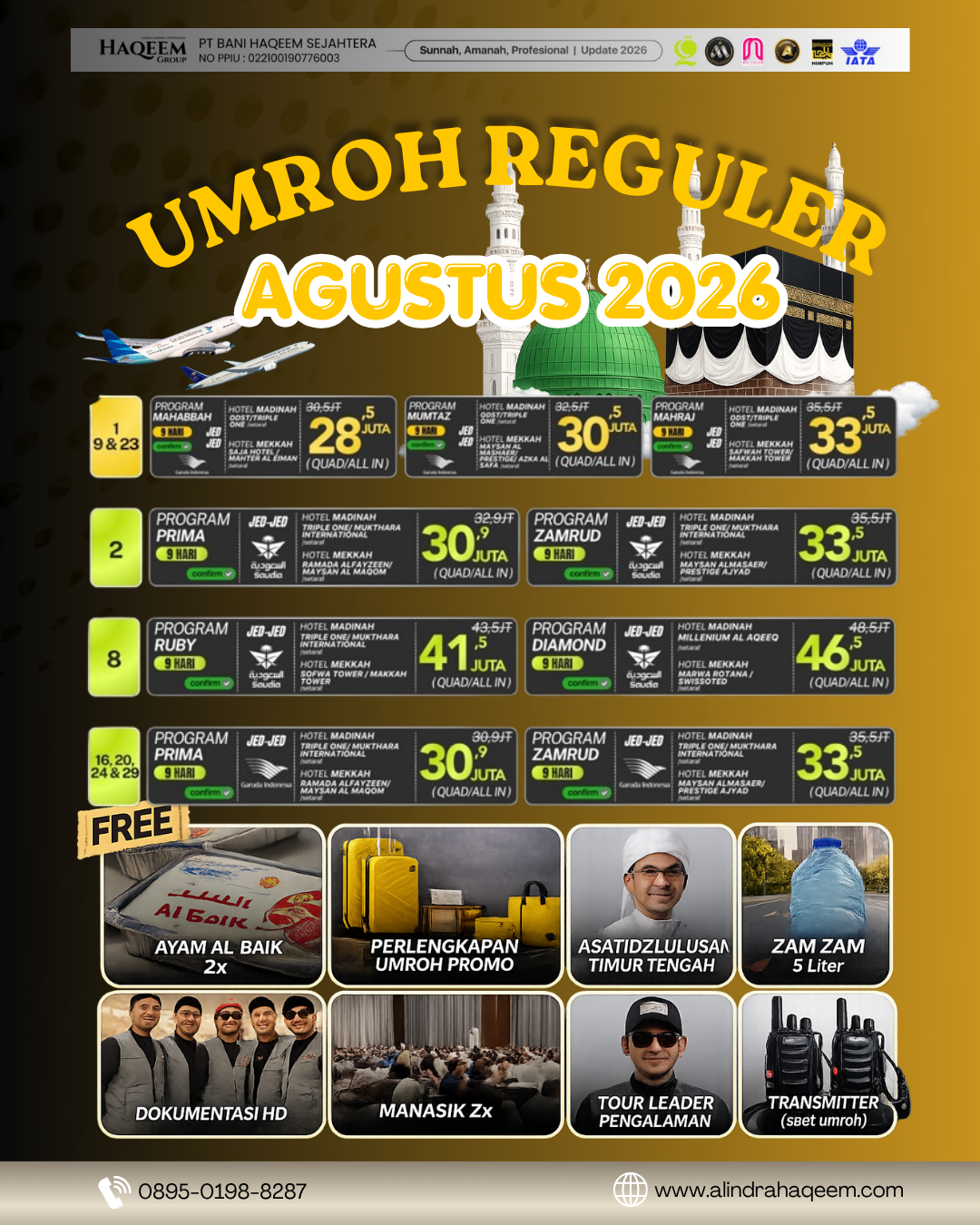 Haqeem Travel adalah Travel Umroh dengan Izin PPIU No. 02210019007760003 Penyelenggara ibadah Umrah yang bisa dipercaya, amanah, jujur, senantiasa berusaha mendampingi tamu-tamu Allah menuju Baitullah dan memberikan pelayanan terbaik guna mencapai ibadah umrah yang makburah